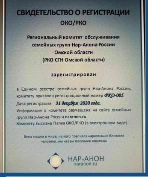 Региональный комитет обслуживания семейных групп Нар-Анона России Омской области (РКО СГН) - в Едином реестре